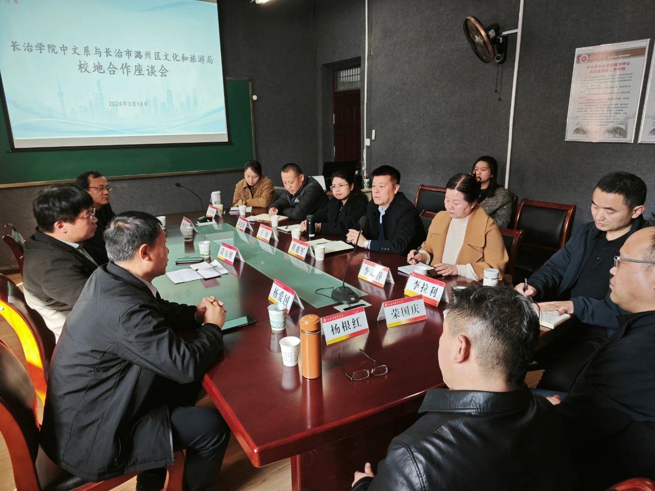 为共同促进长治市文化旅游发展,深化高校与地方间的合作沟通,2024年3月14日下午三点,必威BETWAY西汉姆联与长治市潞州区文化与旅游局校地合作座谈会于办公楼三楼专业写作实训室开展。必威BETWAY领导崔惠军、王利、李素萍、郭旭魁、李拉利,系教师杨根红、荣国庆、闫咚婉,文旅局局长段保明、文旅中心主任杨爱国、副主任杨树人出席本次会议。