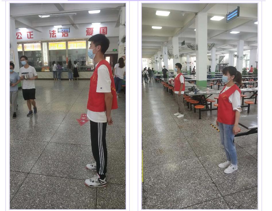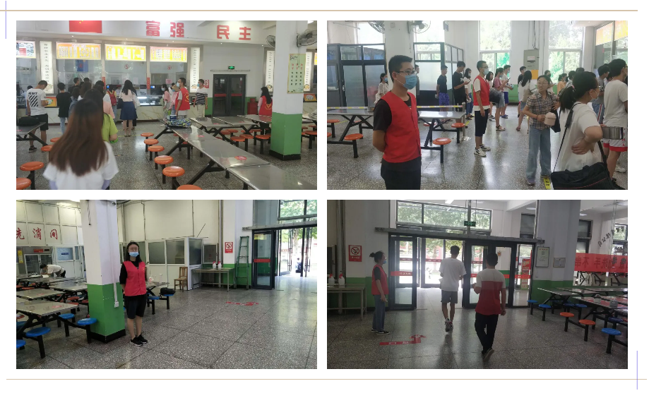 6月1日上午7点,我系党员先锋队的志愿者们走上餐厅疫情防控第一线。在考虑餐厅所开窗口数量、人员流动等因素后,志愿者们将小组成员合理安排在餐厅的每个关键位置,如入口处、出口处、窗口处等等。在志愿服务过程中,先锋队员们全员就位、按时到岗、恪尽职守。在就餐高峰期时,他们时刻提醒排队同学要保持1米以上安全间隔,并及时引导同学有序离开食堂。整个过程井然有序,避免了人员聚集的发生。