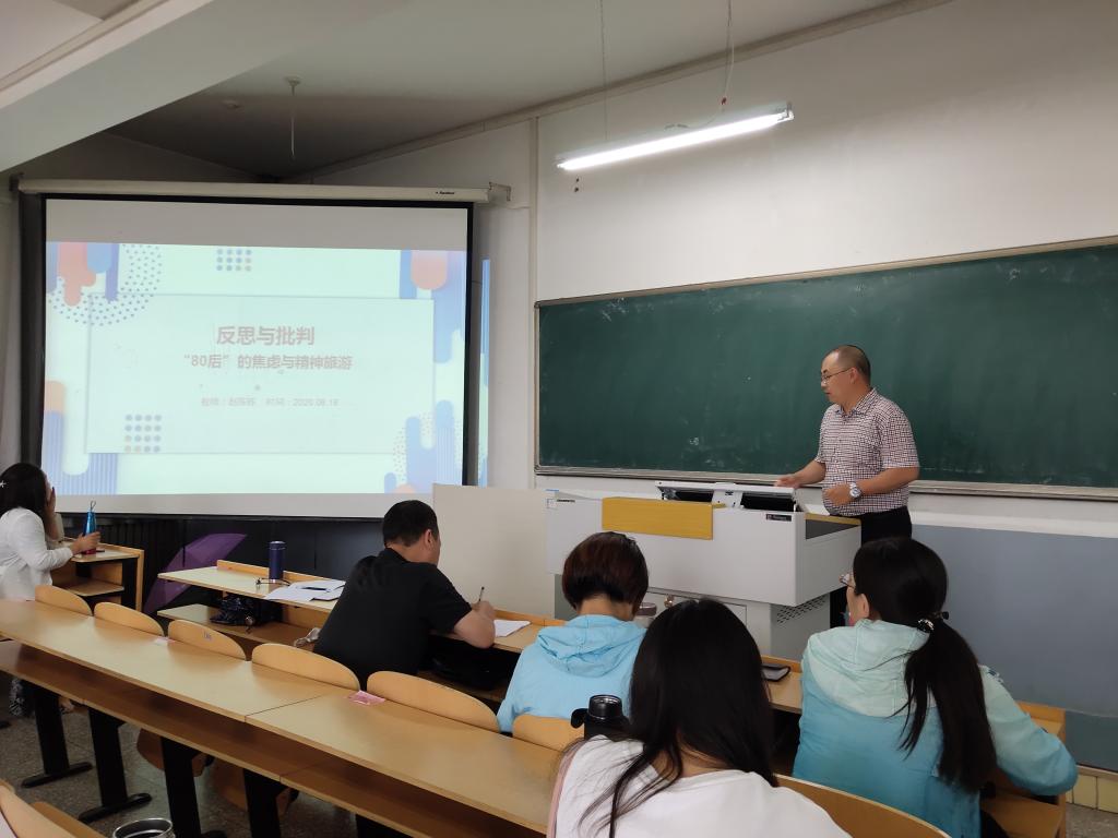 随后,赵栋栋老师以“反思与批判——‘80后’的焦虑与精神旅游”为题,为师生们带来另一场风格独特的课程思政示范课。赵老师从自身“80后”角色的亲身经历出发,历数“80后”在不同成长阶段和不同社会发展时期面临的种种窘境,用看似戏谑的语言,凝练出焦虑背后的背景以及面对焦虑,“80后”如何应对。赵老师将结构主义思想流派与《宫》、《延禧攻略》等穿越剧、古装偶像剧结合,向师生们传达积极向上人生态度的同时,也号召大家回归现实,于生活寻常处寻觅答案。