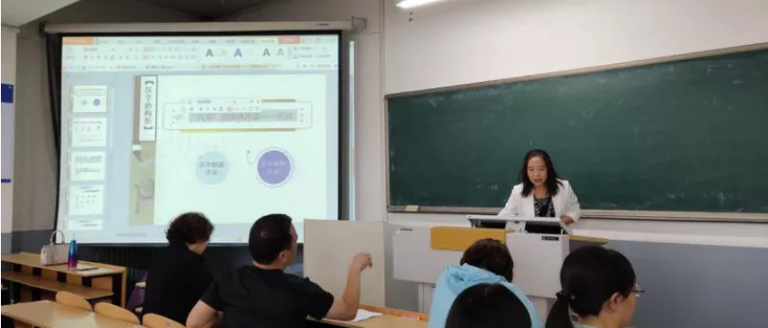 张文霞老师率先以“汉字的构造”为主题,为大家带来课程思政示范课展示。张老师通过一组古代汉字的图片,生动讲授了“汉字的构字法”和“汉字的构形法”。讲解之余,张老师与听讲师生积极互动,课程不乏“神秘感”。“宿”、“妻”、“从”、“休”……学生们难以猜出这些现代常见汉字在古时的模样,不禁感慨传统古汉字和中华古文化的独特魅力。