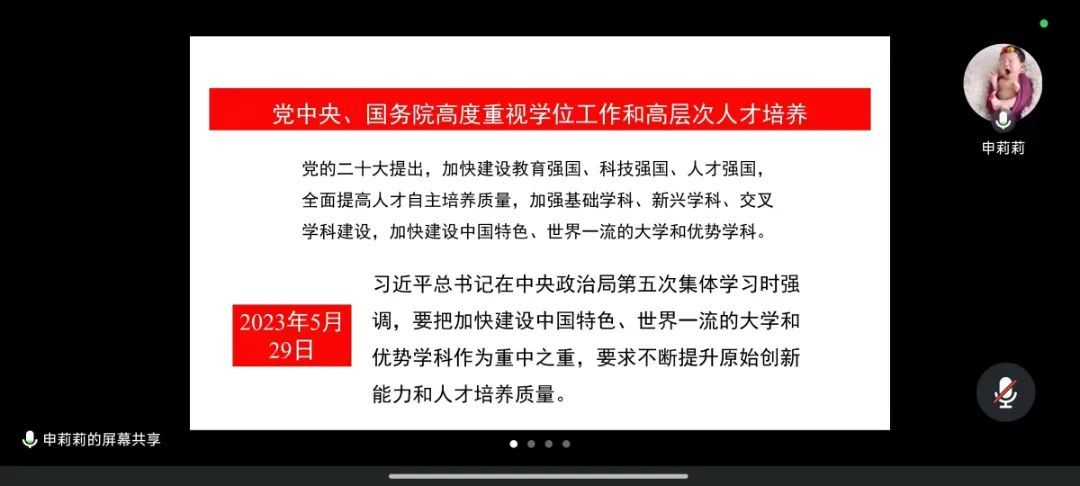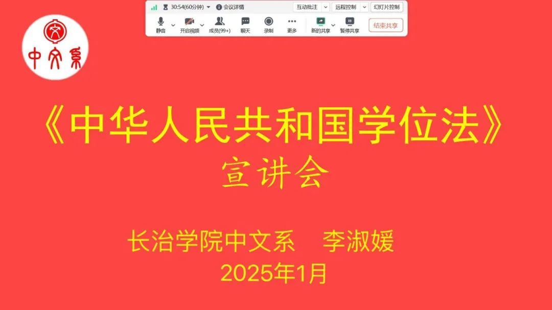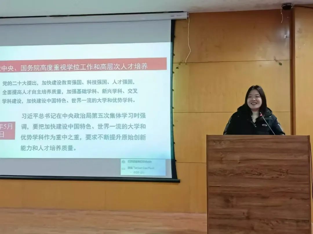 宣讲从《学位法》的立法背景、学位工作体制、学位授予资格、学位授予条件、学位授予程序、学位质量保障等方面全方位地对《学位法》的内容进行了系统解读。《中华人民共和国学位法》是我国教育法治体系中的一部关键性法律,学位法的颁布与实施对于规范学位授予流程、保障学位授予质量、促进高等教育事业的持续健康发展具有至关重要的作用。
