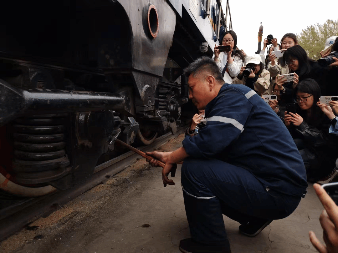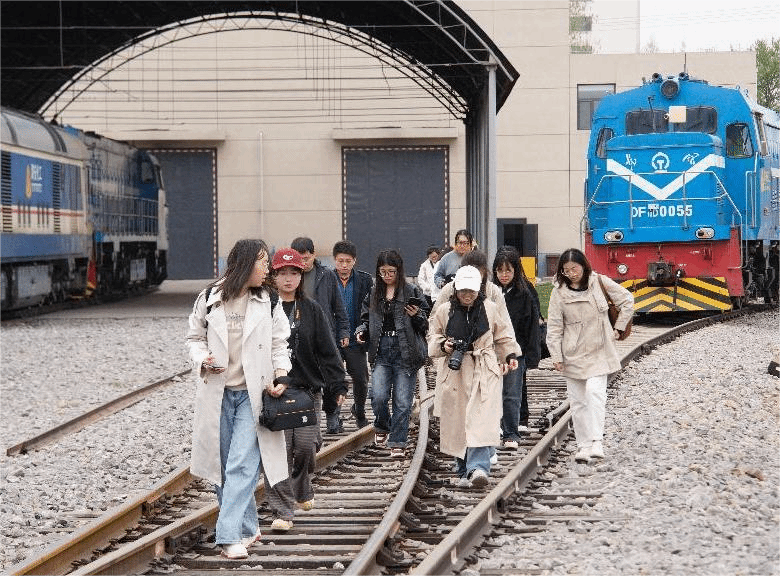 在铁运处工作人员的带领下,学生们还深入新时代文明实践站了解了铁运处企业文化,登上火车参观观摩车头内部结构,并使用照相机捕捉到了工业运输的独特画面。摄影专业教师尹达一和路蓓老师现场指导,从构图、光线运用及主题表达等方面进行现场教学,帮助学生更好地展现工业之美。