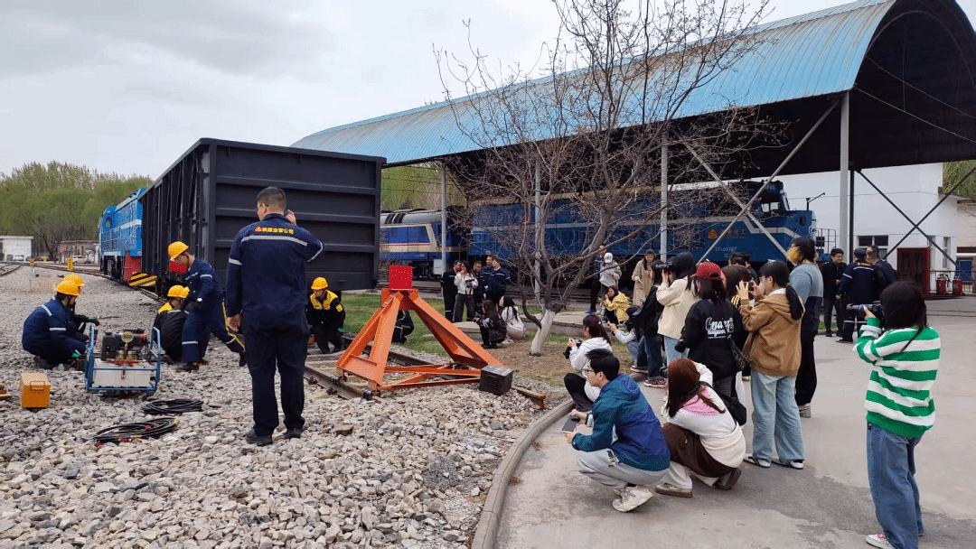 “报告总指挥,公司应急演练,9点52分,0057机车在机务段内7道发生脱轨事故,造成机车第一轮对脱下轨道距线路20cm,现场无人员受伤。”学生抵达作业现场时,机务段的工作人员正在开展机车起复现场处置方案演练活动,同学们见到此景,情不自禁拿起相机,记录下铁路工作人员标准的作业瞬间。
