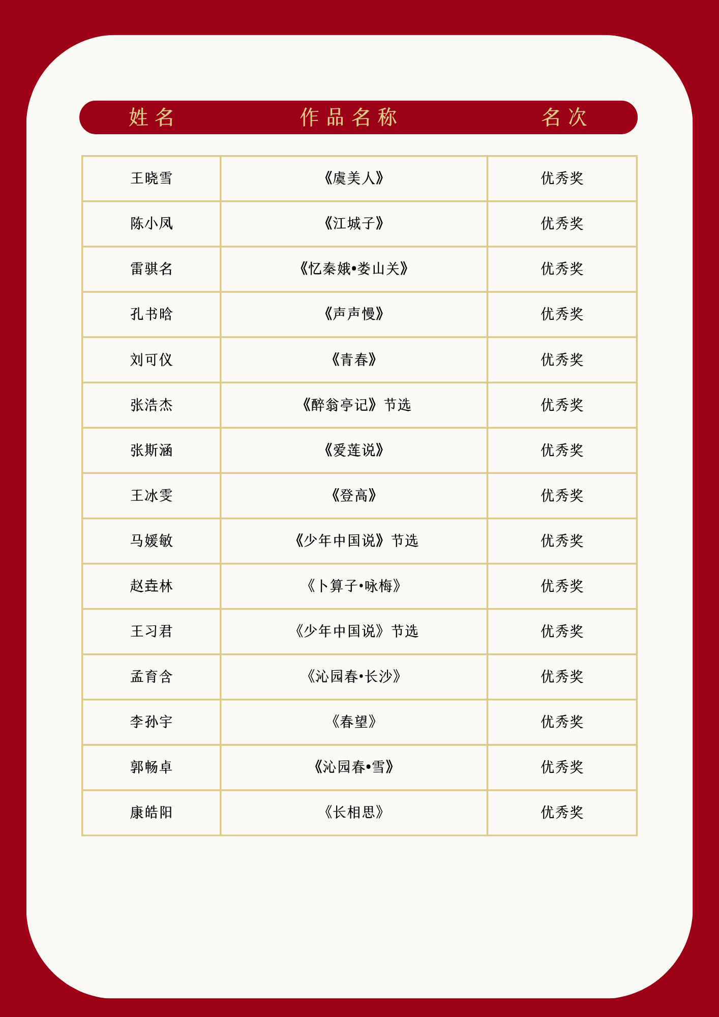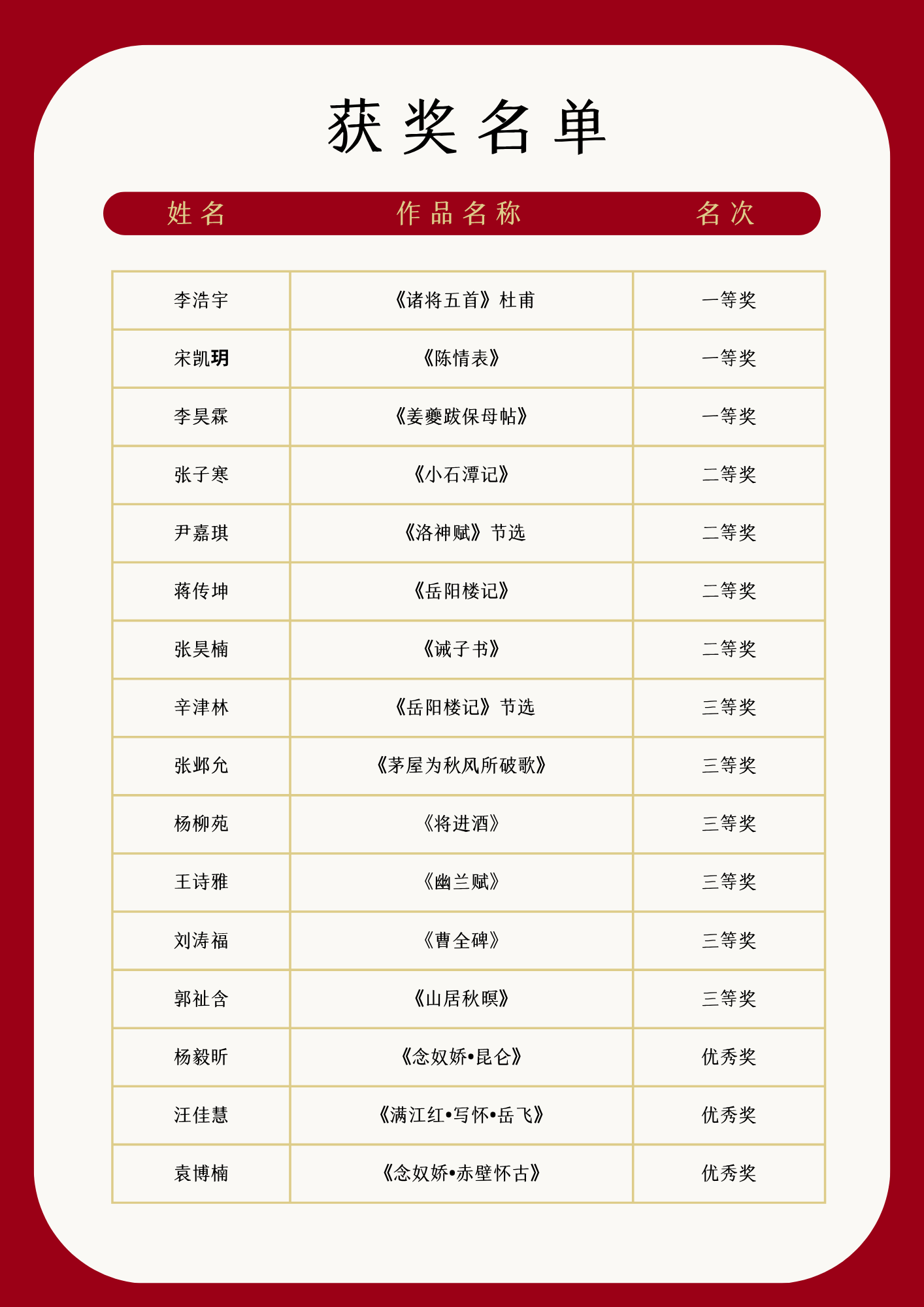 经我系精心组织,并由专业教师团队进行严格、公正的评审,现正式公布本次“笔墨中国”汉字书写大赛系级评选获奖名单。让我们共同祝贺获奖同学,见证我系学子的翰墨风采与卓越才华!
