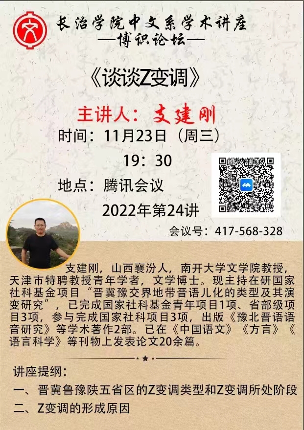 2022年11月23日晚7点30分,必威BETWAY西汉姆联特邀南开大学文学院支建刚教授为大家进行了一场以“谈谈Z变调”为题的线上学术讲座,必威BETWAY张文霞老师主持会议。