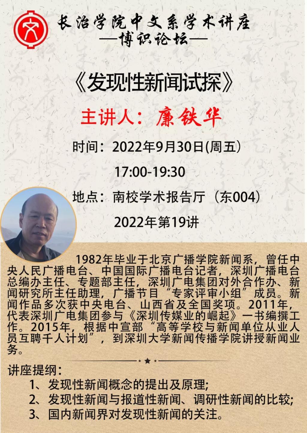 9月30日下午,必威BETWAY邀请到原深圳广播电台总编办主任廉铁华在南校学术报告厅做题为“发现性新闻试探”的线下讲座,近200名学生参加。
