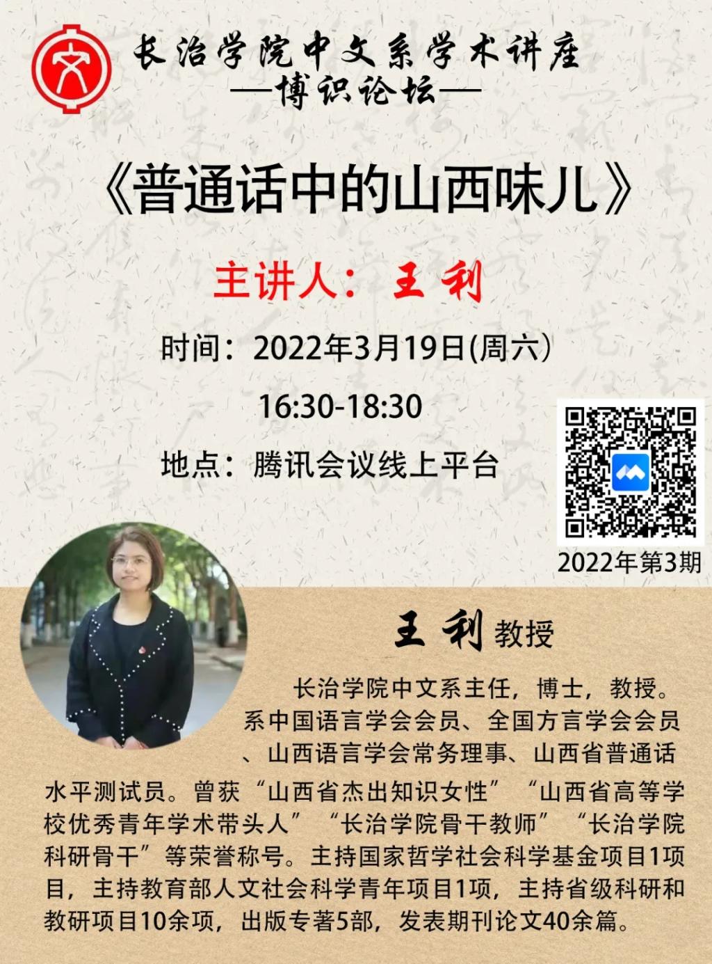 2022年4月17日15:00,必威BETWAY主任王利老师为我系大一同学作题为《普通话中的山西味儿》专题讲座。
