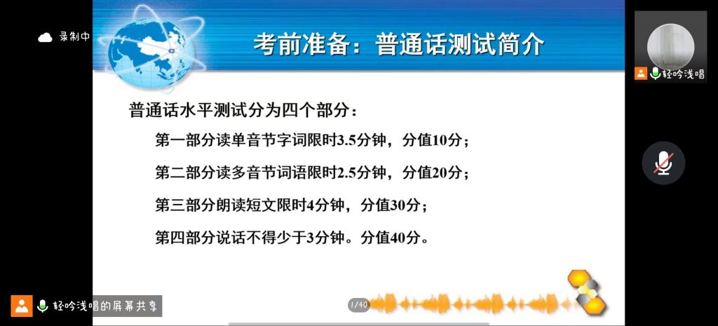 2022年上半年普通话水平测试在即,为了让同学们更好地准备普通话水平测试,王利老师对普通话水平测试考前准备和考试过程进行详细介绍。她叮嘱大家进入考试系统以后,要根据提示戴好耳麦,登录并核对自己的考试信息,试音时声音要响亮,以防声音过小麦克风无法正常接收,正式测试时要保持声音与试音一致等。