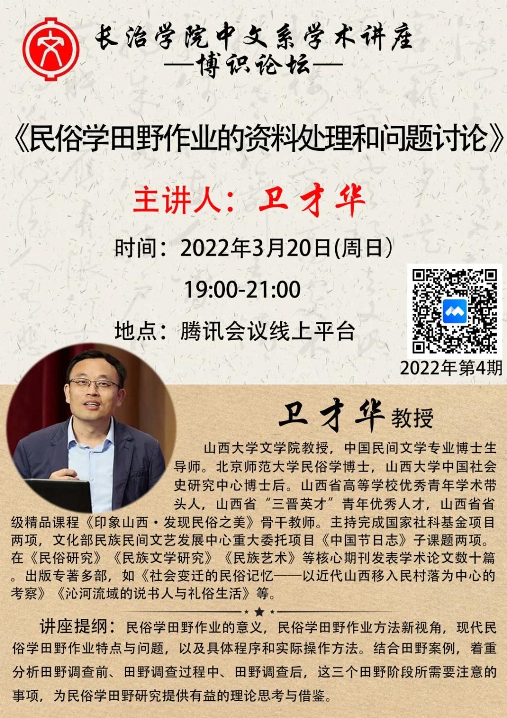 3月20日晚7:00,必威BETWAY开展“民俗学田野作业的资料处理与问题讨论”线上学术讲座,本次讲座由卫才华教授主讲,闫咚婉老师主持,必威BETWAY大三学生及大一民间文学选修课学生参加。