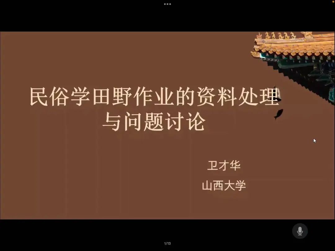 首先,卫老师以“为什么需要田野作业?”为切入点,从找先人创造和世代传承的、仍然活着的“特有性”;在田野中发现具体社会史,寻找文化个性;心系百姓命运,服务民生,建立活泼真实的民俗文化知识系统;促进跨文化、跨学科综合的地方社会文化研究四个方面进行解答。