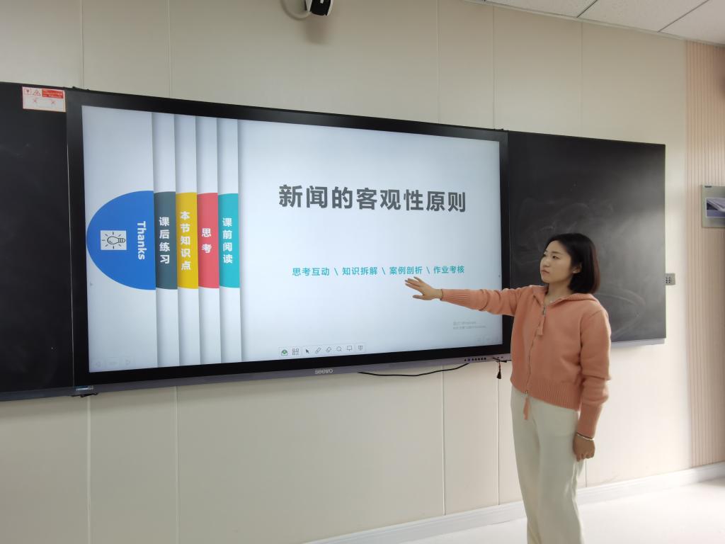 徐欣老师由社会热点“刘学洲事件”引出授课的主题《新闻的客观性原则》,并以此为线索展开课堂,从客观性理念的提出、内涵分析,评析刘学洲事件中媒体报道的客观性,落脚到新媒体时代如何坚守新闻的客观性原则。她教学思路清晰,结构严谨,把微笑带进了课堂,把魅力带进了课堂,赢得了在场老师的阵阵掌声。