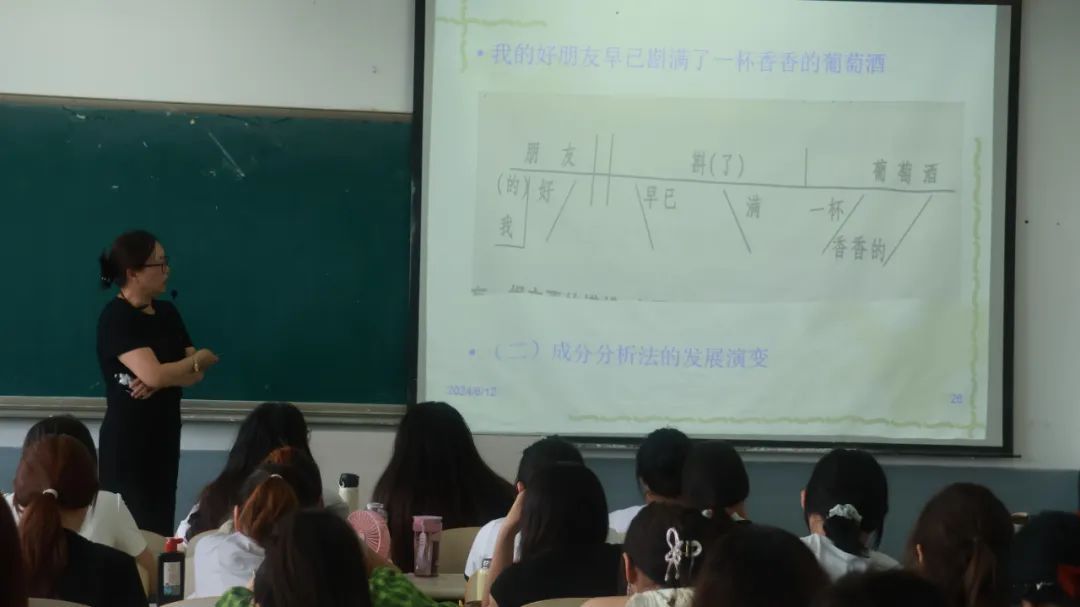 首先,李金梅老师介绍了现代汉语学习中的歧义现象,指明了歧义的类型、格式以及如何消除歧义。接着,李金梅老师对层次分析法进行讲解,在现代汉语中层次分析法可以帮助研究者更系统、更科学地进行语言研究和语言教学。最后,李老师结合例题,让同学们体会到了层次分析法的精髓和重要性。