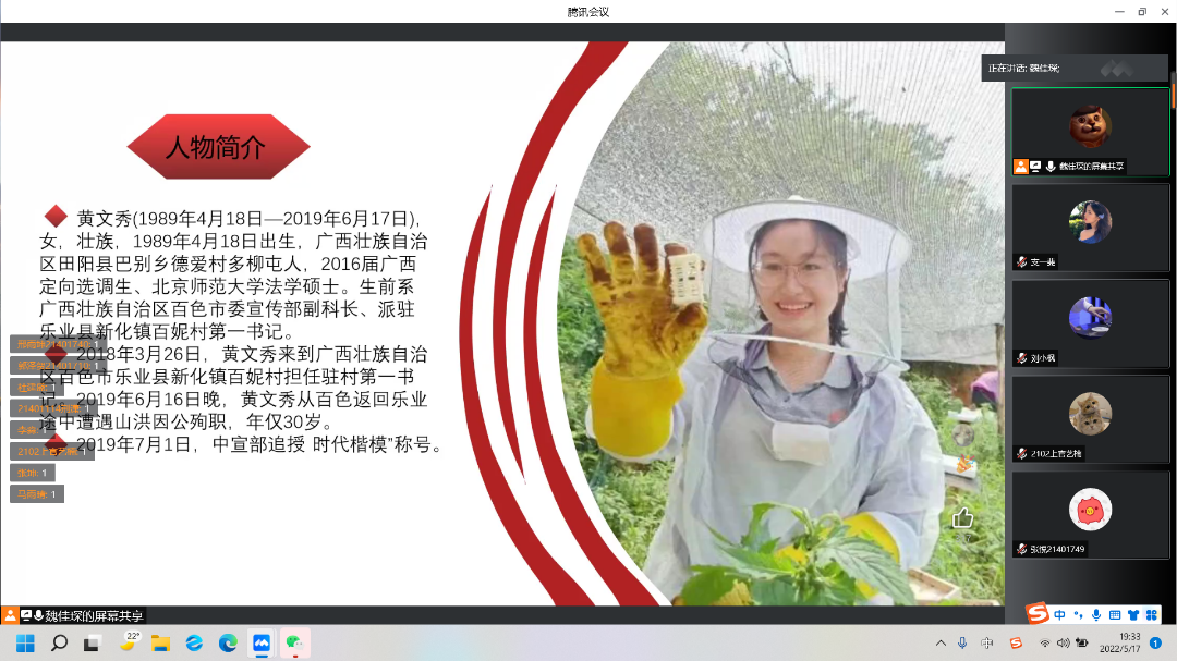 在时代楷模黄文秀事迹的影响下,“文秀的礼物”主题思政班会于5月17日19:30在线上举办。该班会是由“《文秀的礼物》:文化普惠与公益衍生项目团队”的刘小枫同学主讲、魏佳琛同学主持。