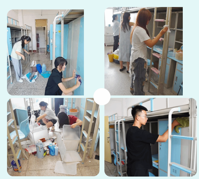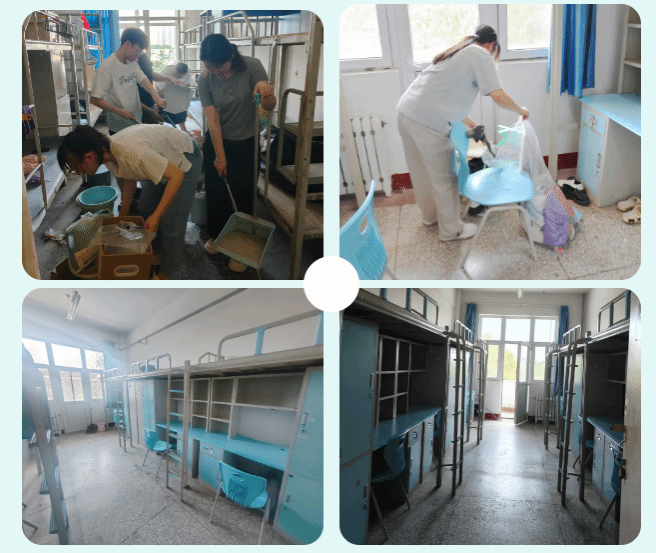 6月27日学生自愿带上打扫工具、垃圾袋等,按学生党支部安排,分组进入预定宿舍。大家分工明确,仔细清理毕业生离校后遗留的杂物和积尘,清扫工作井然有序地展开,经过清理,57间原本略显凌乱的宿舍变得窗明几净,地面光洁,物品摆放整齐,为后续新生入住做好准备。