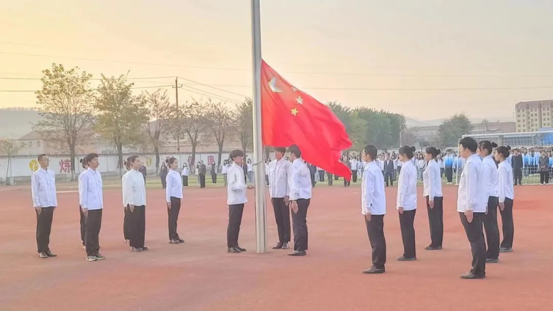 于七点整,升旗仪式正式开始。五星红旗迎风飘扬,伴随着嘹亮的《义勇军进行曲》,五星红旗冉冉升起。全体师生齐唱国歌,并肃立行注目礼。升旗仪式结束后,国旗护卫队有条不紊地退场。