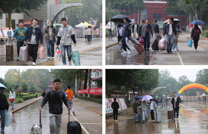 身后是学长们辛勤地搬运行李的背影。