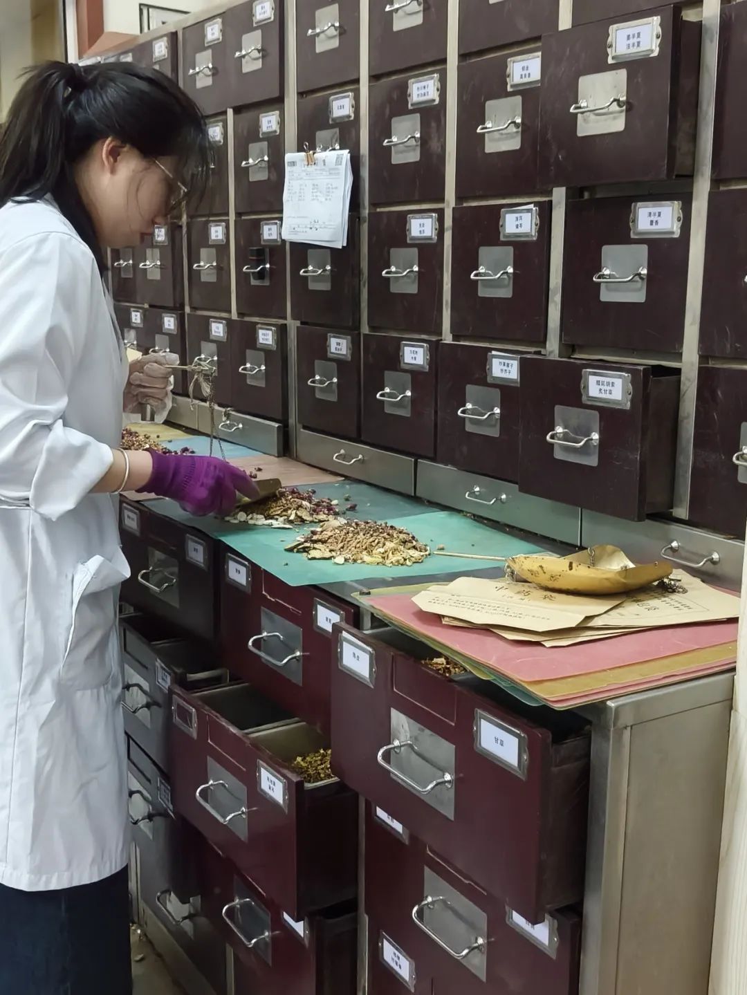 接着,同学们来到了药房。药柜上,百余个抽屉整齐排列,每个抽屉上都贴着工整的标签,写着不同的药材名称。药工熟练地拉开抽屉,用戥子精准称量药材,那手法如行云流水,仿佛在演绎一场精妙的艺术。同学们通过体验抓药,触摸到了中医药“调和致中”的深邃哲学。