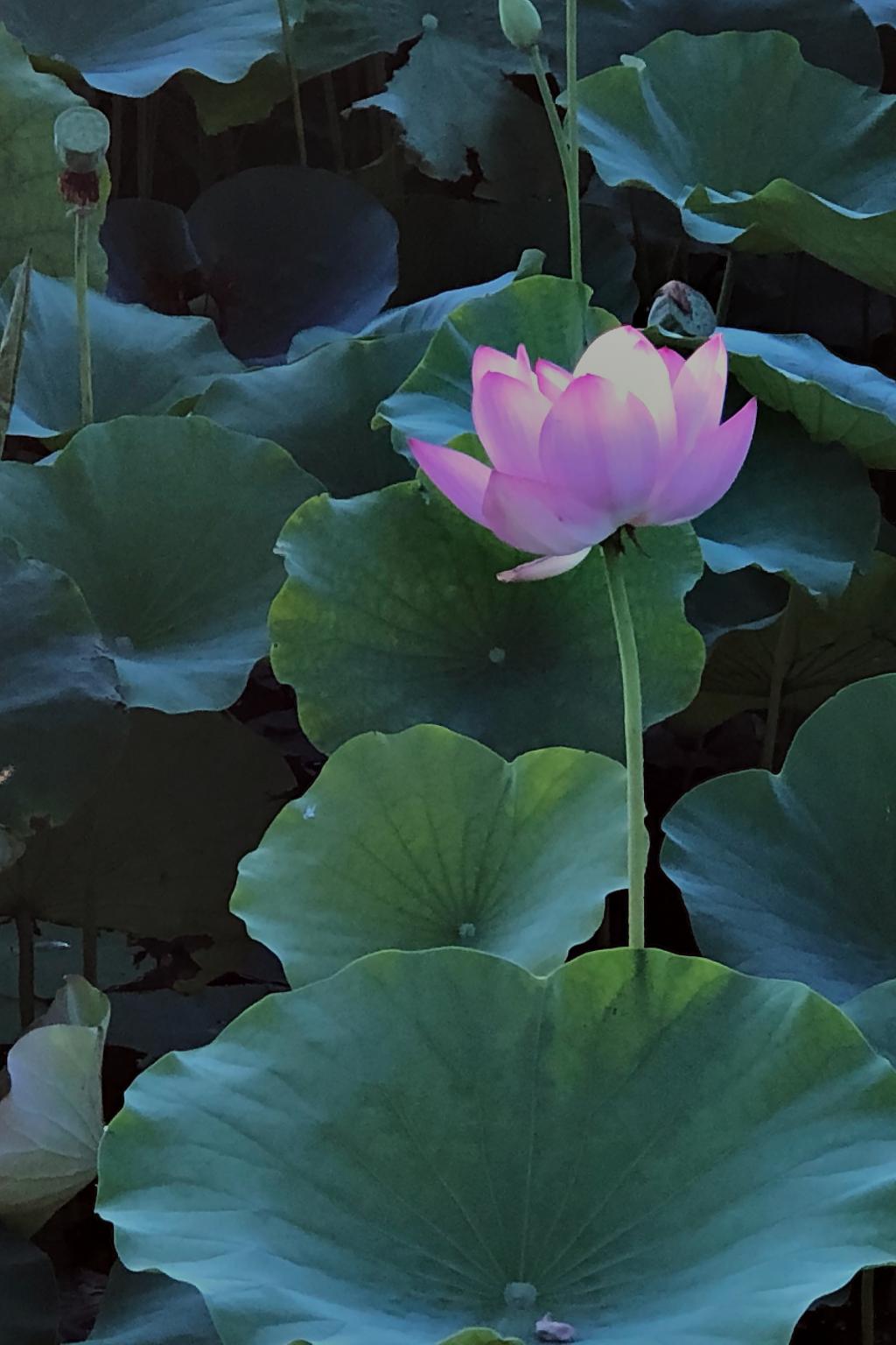 作品阐述:一场大雨让人为漳泽湿地的一池莲花着急。次日前往,我们发现有的莲的花瓣被打散了,有的依然盛开,有的含苞待放、小荷才露尖尖角。其中有一支莲在周边莲叶的衬托下十分突出,观之心神宁静,如沐清风,让人想到周敦颐《爱莲说》中的“中通外直,不蔓不枝,香远益清,亭亭净植,可远观而不可亵玩焉。”