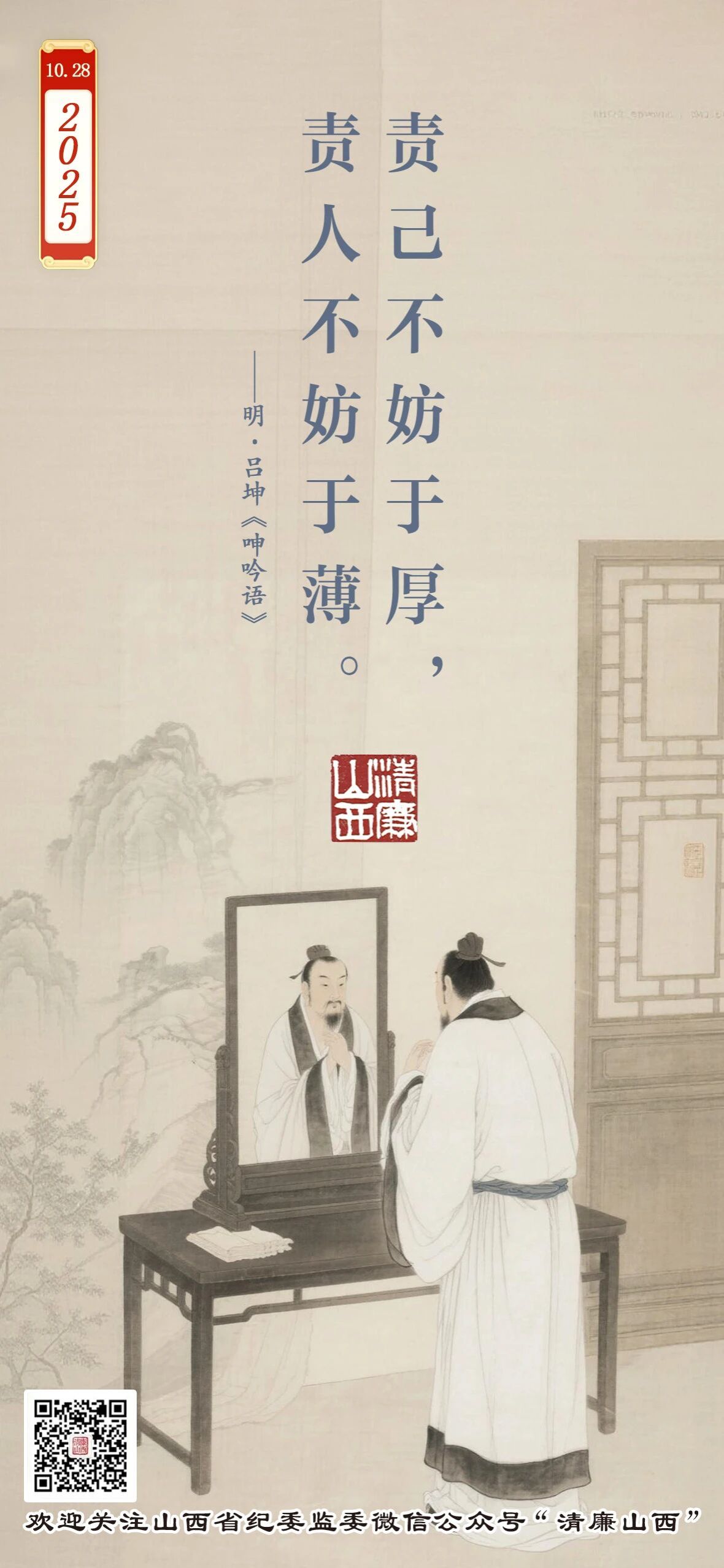 这句话出自明代吕坤所著的《呻吟语》,其意思是,责备自己时不妨严格一些,责备他人时不妨宽容一些。此言虽简,却蕴含着深刻的道理。为人处世唯有勤于反观自身,检点自己的不足,做到严于律己、宽以待人,才能有过必改,日臻至善。